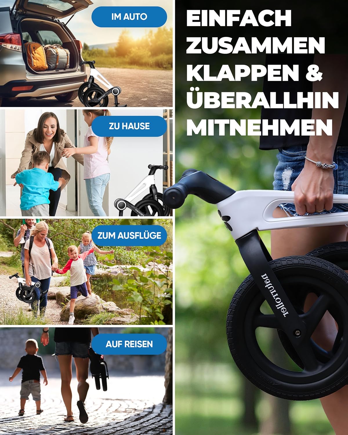 Einer der Nachteile eines Laufrads ist, dass es aufgrund seiner Größe schwer zu transportieren ist. Unser Kinder Laufrad ab 2 Jahren lässt sich jedoch mit einem Handgriff zusammenklappen und nimmt nur wenig Platz ein. Der klappbare